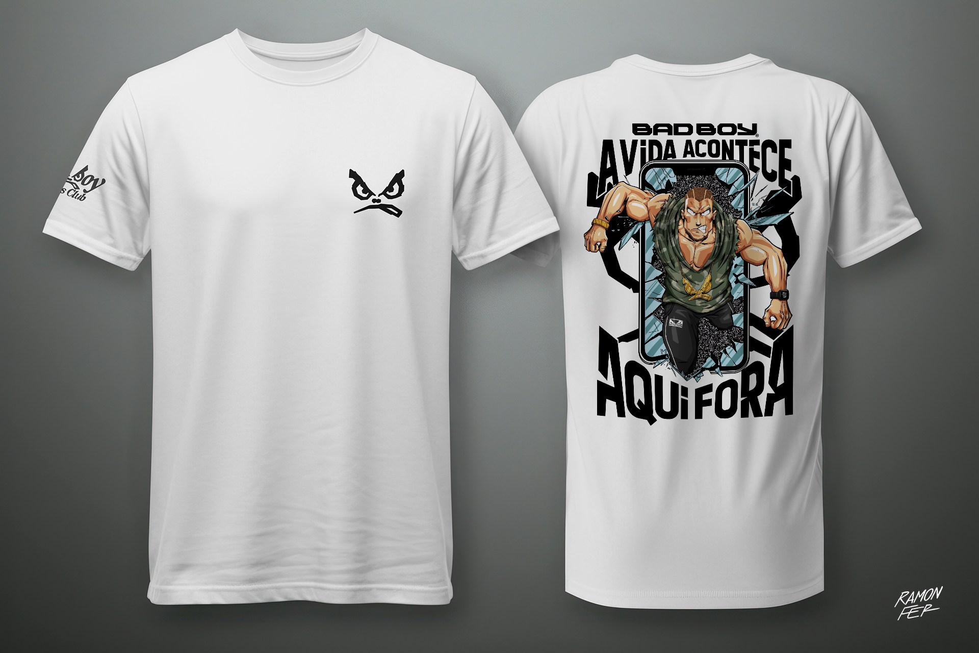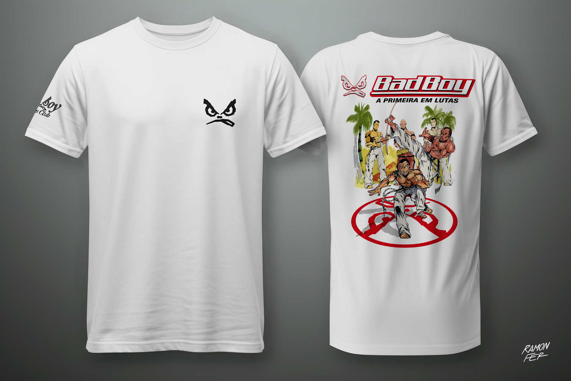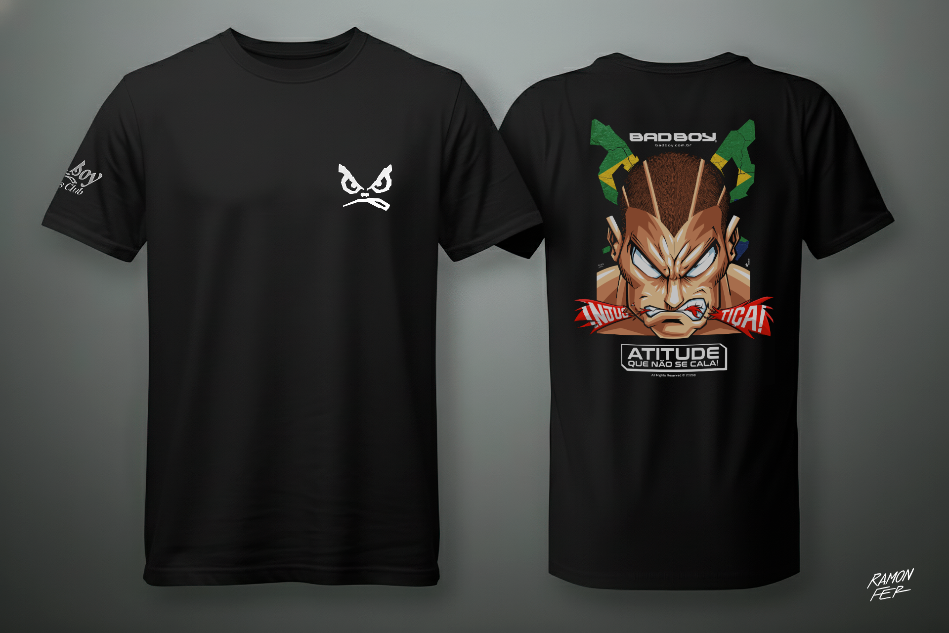 Esta coleção de ilustrações para a marca 𝗕𝗮𝗱 𝗕𝗼𝘆 demonstra a capacidade de unir o 𝘯𝘰𝘴𝘵𝘢𝘭𝘨𝘪𝘢 𝘥𝘦𝘴𝘪𝘨𝘯 com o comentário social contemporâneo. O projeto incluiu a recuperação e relançamento de 𝗲𝘀𝘁𝗮𝗺𝗽𝗮𝘀 icônicas dos 𝗮𝗻𝗼𝘀 𝟵𝟬, como a 'JIU-JITSU 𝘍𝘳𝘦𝘦𝘴𝘵𝘺𝘭𝘦 𝘔𝘦𝘯𝘵𝘢𝘭𝘪𝘵𝘺' e 'CAPOEIRA 𝘉𝘢𝘥 𝘉𝘰𝘺 - 𝘈 𝘱𝘳𝘪𝘮𝘦𝘪𝘳𝘢 𝘦𝘮 𝘓𝘶𝘵𝘢𝘴', reforçando os valores centrais da marca: vigor, força física e principalmente a honra. Paralelamente, foram criadas estampas inéditas com forte apelo conceitual, como 'A VIDA ACONTECE AQUI FORA', que utiliza a imagem do mascote saindo de uma tela de celular quebrada para criticar a alienação digital em favor da experiência no mundo real. O destaque conceitual fica por conta da estampa 'INJUSTIÇA - Atitude que não se cala', que emprega uma iconografia poderosa — o mascote com mordaça vermelha sobre um fundo com as cores nacionais em estilo rachado — para refletir a necessidade de 𝗽𝗼𝘀𝗶𝗰𝗶𝗼𝗻𝗮𝗺𝗲𝗻𝘁𝗼 em um cenário social 𝗰𝗼𝗺𝗽𝗹𝗲𝘅𝗼. A qualidade e a profundidade conceitual desta estampa foram reconhecidas internamente, resultando na aprovação por excelência e na produção dessa edição 𝗮𝘂𝘁𝗼𝗴𝗿𝗮𝗳𝗮𝗱𝗮 𝗽𝗼𝗿 𝗺𝗶𝗺. Este trabalho evidencia o domínio na criação de ilustrações de alto impacto visual e forte ressonância temática para o mercado de 𝘴𝘵𝘳𝘦𝘦𝘵𝘸𝘦𝘢𝘳 e artes marciais.