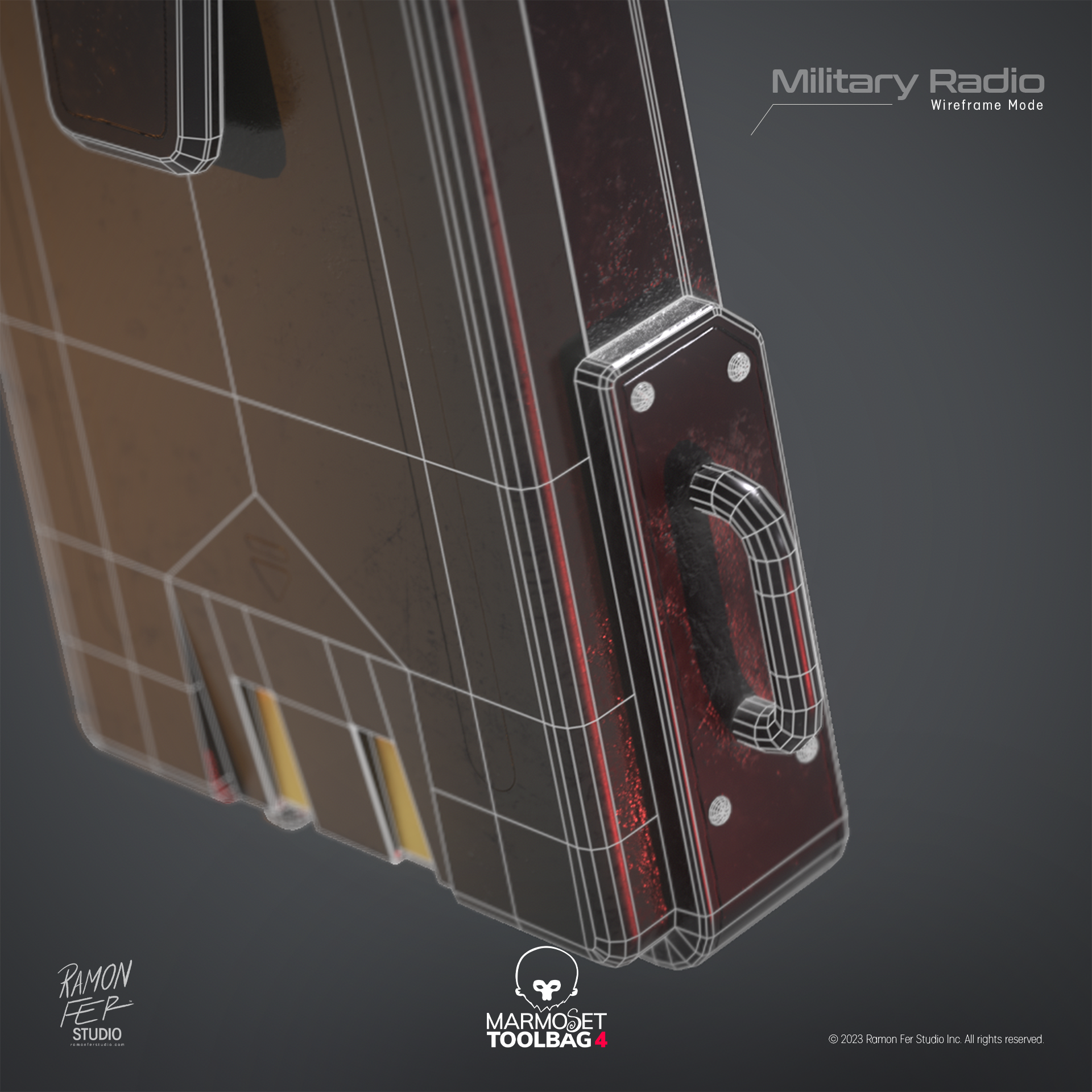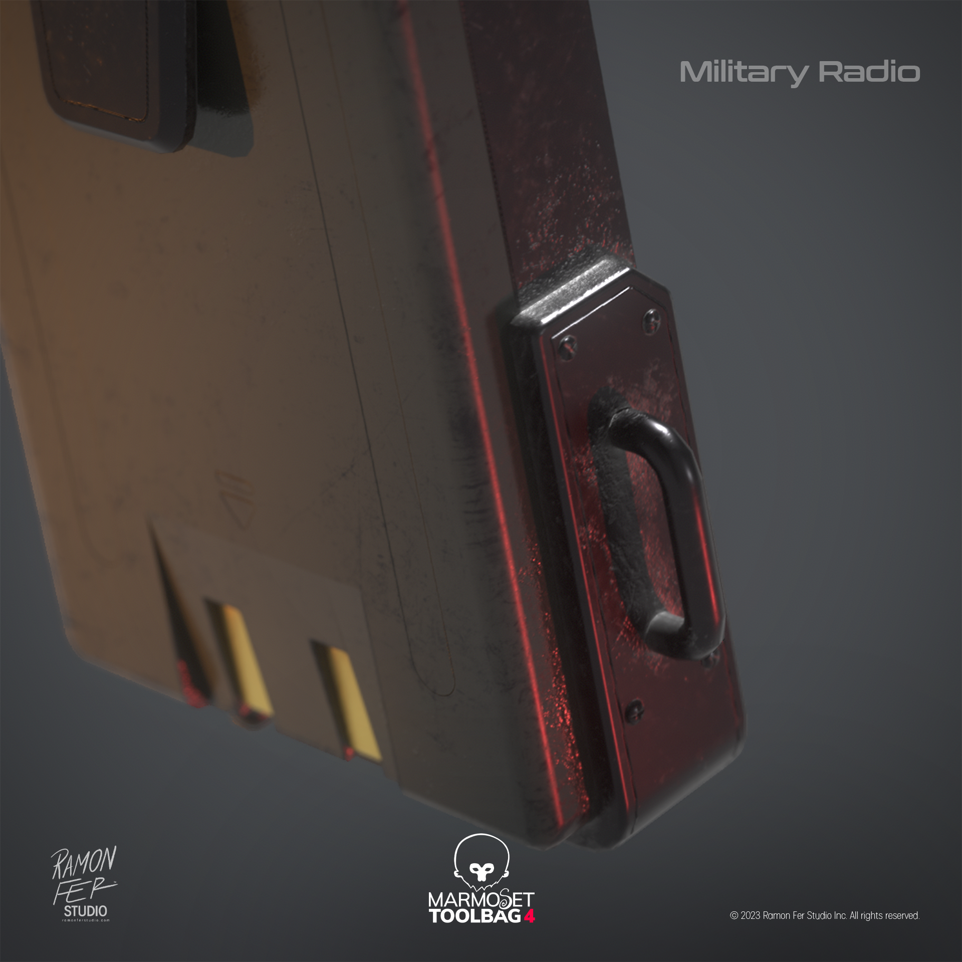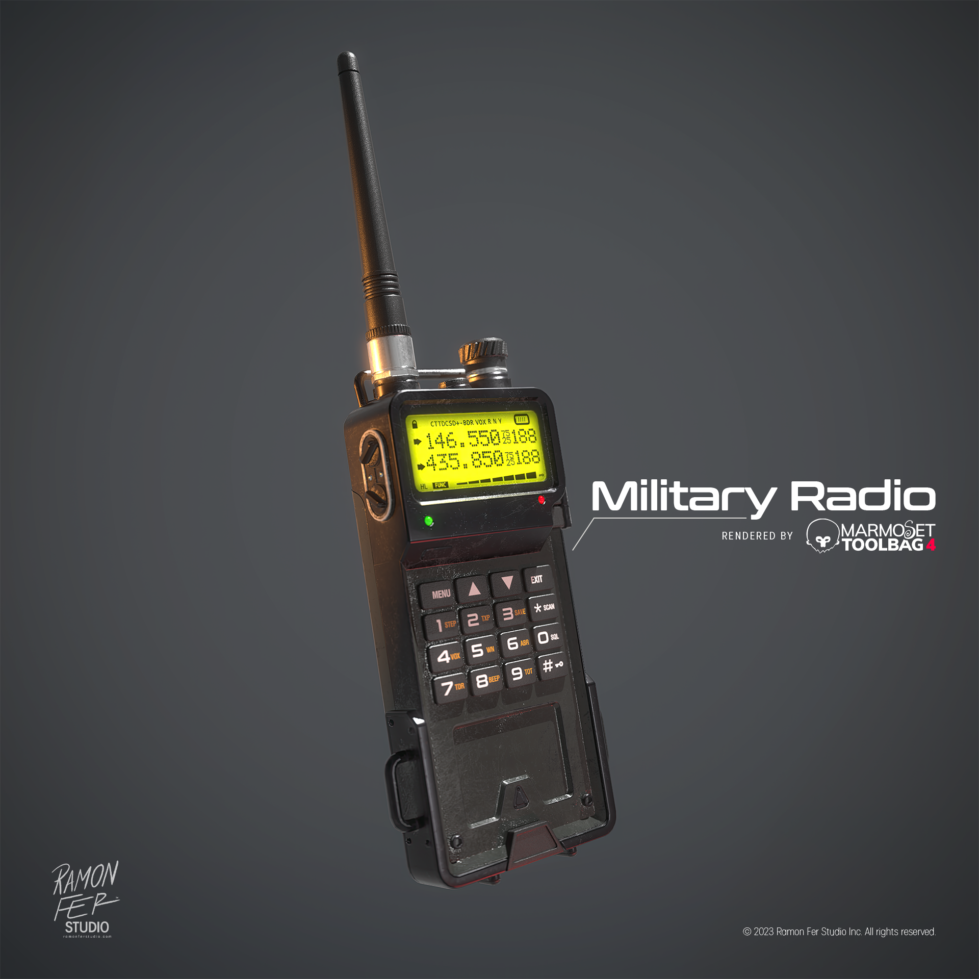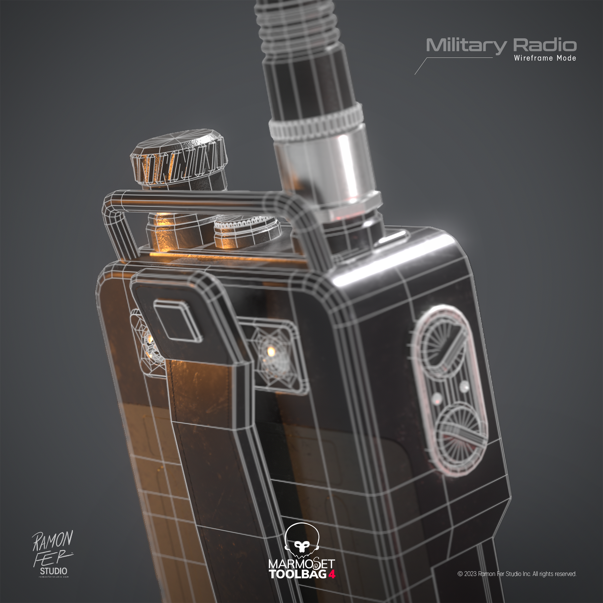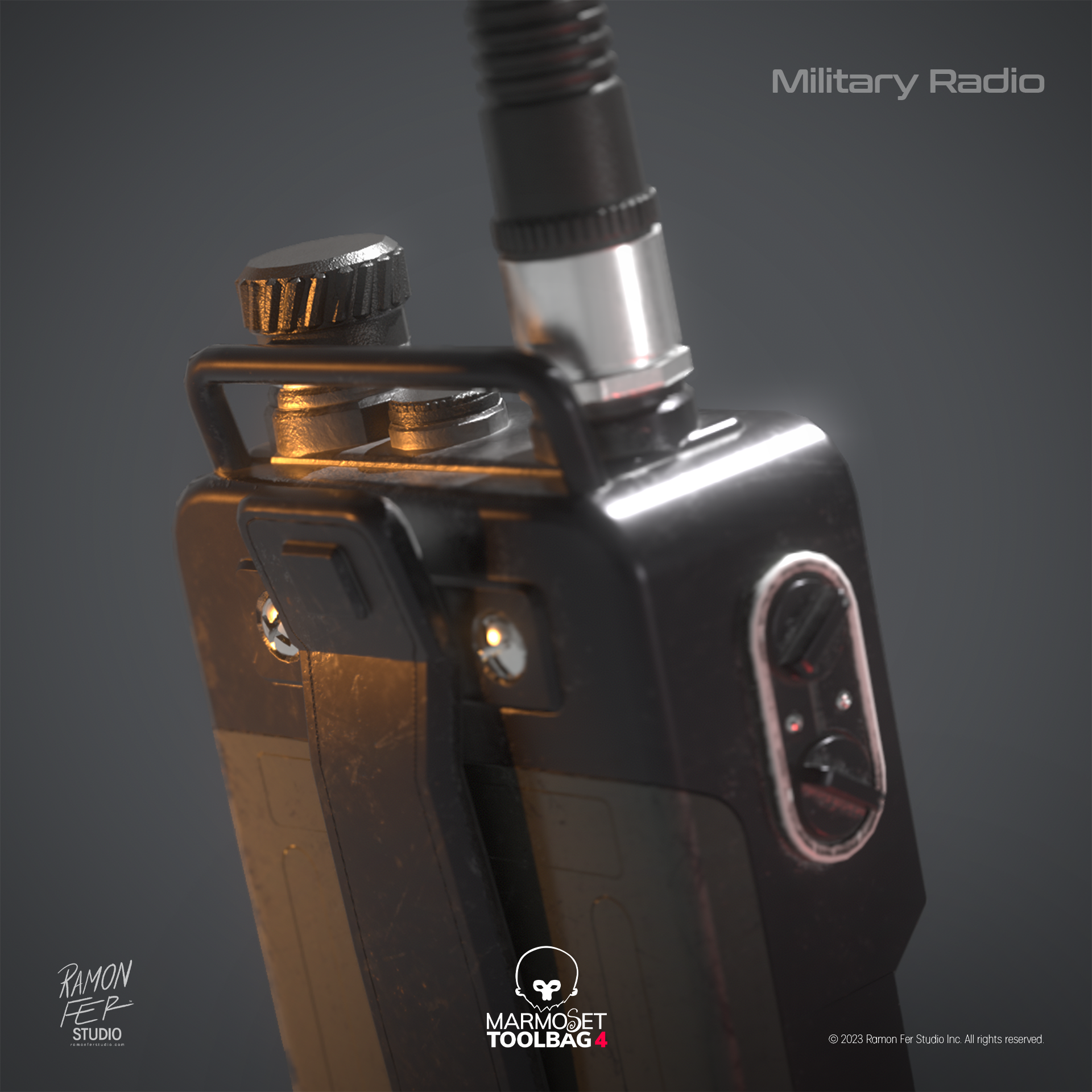 O Rádio Comunicador Militar é a materialização de um estudo intenso de texturização e otimização. O principal desafio técnico superado foi aprimorar o detalhamento de superfícies — incluindo entalhes e protuberâncias — utilizando técnicas avançadas de 𝘴𝘩𝘢𝘥𝘪𝘯𝘨 para evitar a complexidade geométrica. O resultado final é uma representação de alta fidelidade onde a harmonia entre materiais (do plástico áspero ao metal polido) é evidenciada pela iluminação dramática. A satisfação reside na prova de que é possível atingir um realismo visual superior e um acabamento de qualidade profissional, mantendo uma malha eficiente e limpa.